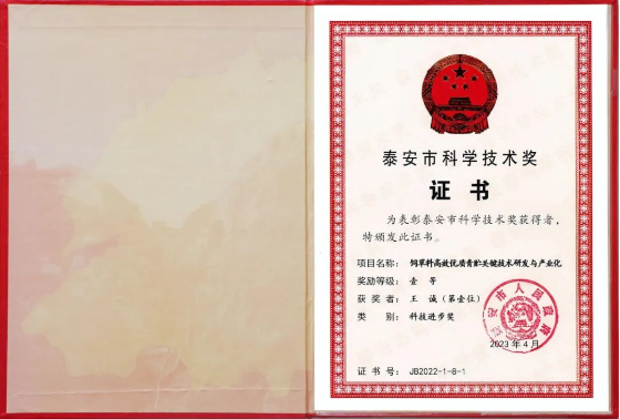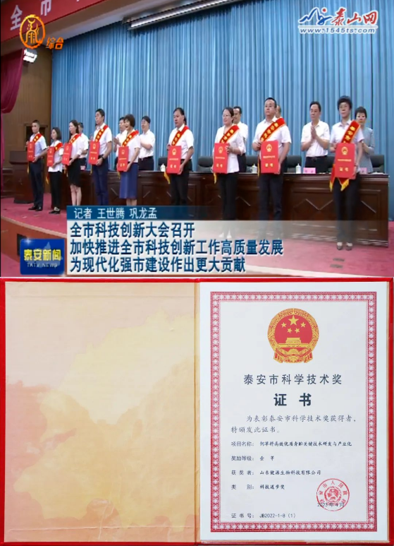 會議宣讀了泰安市人民政府《關于2022年度科學技術獎勵的決定》和《關于下達2023年泰安市科技創新“雙十工程”項目的通知》,并為2022年度科學技術獎獲獎代表頒獎。山東健源生物科技有限公司《飼草料高效優質青貯關鍵技術研發與產業化》項目榮獲泰安市科學技術進步獎一等獎。