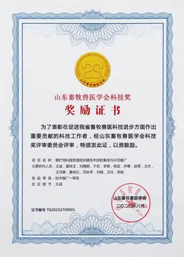 發(fā)布時間:[2023-9-18 14:34:45] 瀏覽量:5094次該獎項由山東畜牧獸醫(yī)學(xué)會設(shè)立,根據(jù)《山東畜牧獸醫(yī)學(xué)會科技獎獎勵辦法(試行)》的規(guī)定,經(jīng)山東畜牧獸醫(yī)學(xué)會科技獎勵工作委員會評審,對為我省畜牧獸醫(yī)事業(yè)科技進(jìn)步和創(chuàng)新做出突出貢獻(xiàn)的集體和個人給予的獎勵。