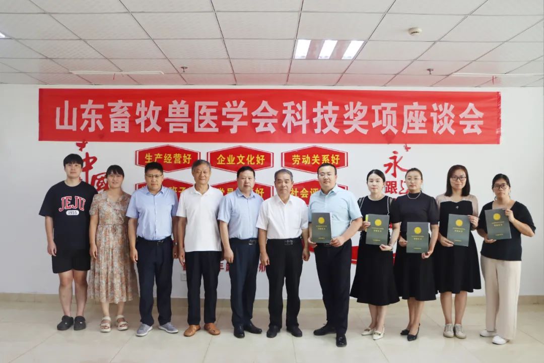 2023年9月9日,泰安市科技局黨組成員、四級調(diào)研員李華定,山東畜牧獸醫(yī)學(xué)會黨支部書記、副理事長兼秘書長崔言順教授,山東畜牧獸醫(yī)學(xué)會副秘書長、山東農(nóng)業(yè)大學(xué)趙孝民教授,山東畜牧獸醫(yī)學(xué)會副秘書長、山東農(nóng)業(yè)大學(xué)張桂國教授,山東農(nóng)業(yè)大學(xué)郭翠華教授,山東農(nóng)業(yè)大學(xué)中韓交流生嫝珉赫蒞臨公司座談,并為獲獎人員頒發(fā)獎勵證書。