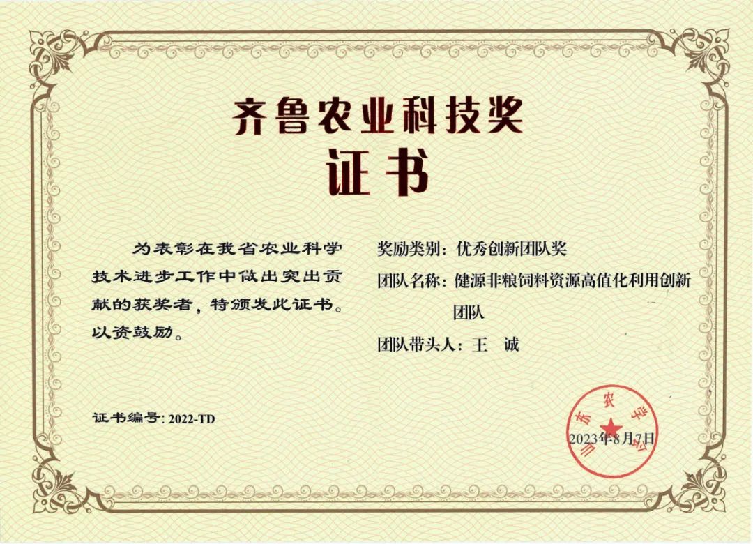 由山東健源生物有限公司董事長(zhǎng)王誠作為團(tuán)隊(duì)帶頭人,帶隊(duì)的“健源非糧飼料資源高值化利用創(chuàng)新團(tuán)隊(duì)”榮獲2022年度齊魯農(nóng)業(yè)科技獎(jiǎng)優(yōu)秀創(chuàng)新團(tuán)隊(duì)獎(jiǎng)。