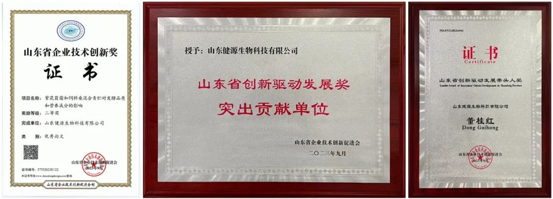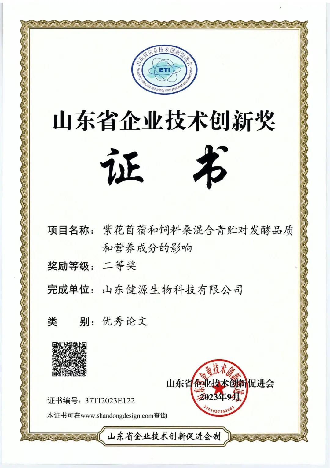 為深入貫徹落實創(chuàng)新驅(qū)動發(fā)展戰(zhàn)略,強化企業(yè)技術(shù)創(chuàng)新主體地位,全面提升企業(yè)創(chuàng)新能力,選樹一批示范帶頭企業(yè)、優(yōu)秀工作者及創(chuàng)新成果,鼓勵我省企業(yè)和廣大技術(shù)創(chuàng)新工作者不斷做出新的貢獻(xiàn)。根據(jù)《山東省科學(xué)技術(shù)廳關(guān)于進(jìn)一步鼓勵和規(guī)范山東省社會力量設(shè)立科學(xué)技術(shù)獎的指導(dǎo)意見》《山東省企業(yè)技術(shù)創(chuàng)新促進(jìn)會章程》和《山東省企業(yè)技術(shù)創(chuàng)新促進(jìn)會技術(shù)創(chuàng)新獎獎勵辦法》有關(guān)要求,結(jié)合工作實際,組織開展2023年山東省企業(yè)技術(shù)創(chuàng)新促進(jìn)會技術(shù)創(chuàng)新獎評選工作。根據(jù)《山東省企業(yè)技術(shù)創(chuàng)新促進(jìn)會技術(shù)創(chuàng)新獎獎勵辦法》和有關(guān)評審細(xì)則,評選活動結(jié)果公示。山東健源生物科技有限公司榮獲山東省創(chuàng)新驅(qū)動發(fā)展獎突出貢獻(xiàn)單位。公司論文《紫花苜蓿和飼料桑混合青貯對發(fā)酵品質(zhì)和營養(yǎng)成分的影響》榮獲山東省企業(yè)技術(shù)創(chuàng)新獎優(yōu)秀論文二等獎。公司研發(fā)部負(fù)責(zé)人董桂紅榮獲山東省創(chuàng)新驅(qū)動發(fā)展帶頭人獎。