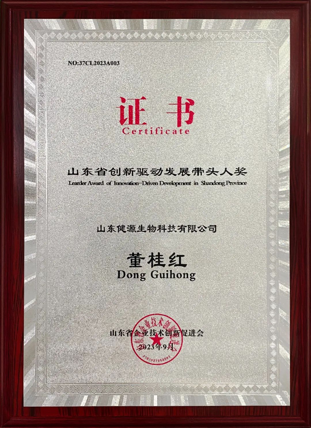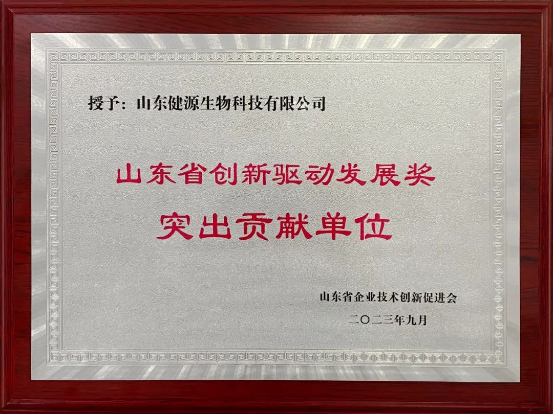山東健源生物科技有限公司榮獲山東省創(chuàng)新驅(qū)動發(fā)展獎突出貢獻(xiàn)單位