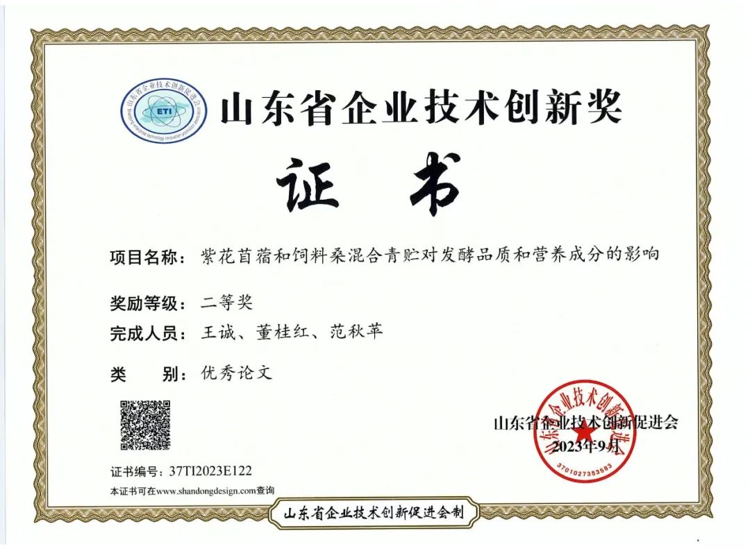 山東省創(chuàng)新驅(qū)動發(fā)展獎突出貢獻(xiàn)單位《紫花苜蓿和飼料桑混合青貯對發(fā)酵品質(zhì)和營養(yǎng)成分的影響》榮獲山東省企業(yè)技術(shù)創(chuàng)新獎