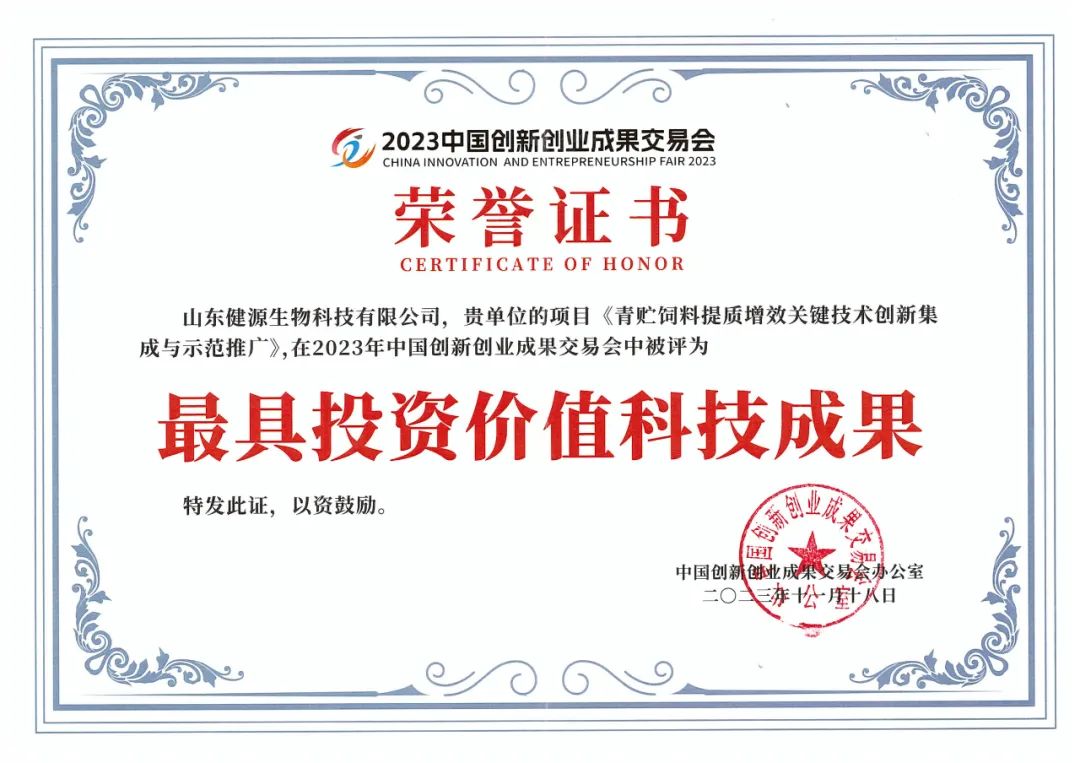 山東健源生物科技有限公司的《青貯飼料提質增效關鍵技術創(chuàng)新集成與示范推廣》項目在2023年中國創(chuàng)新創(chuàng)業(yè)成果交易會中被評為最具投資價值科技成果,該獎項的獲得充分肯定了健源生物在技術創(chuàng)新方面的卓越表現(xiàn)以及公司科技成果在市場應用方面的優(yōu)秀潛力。