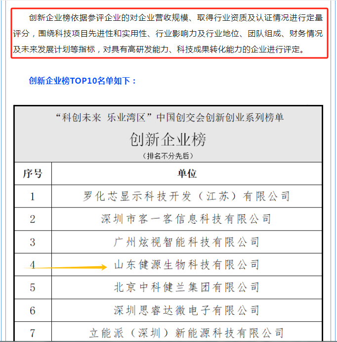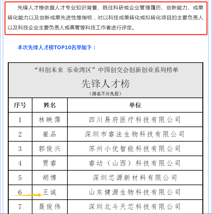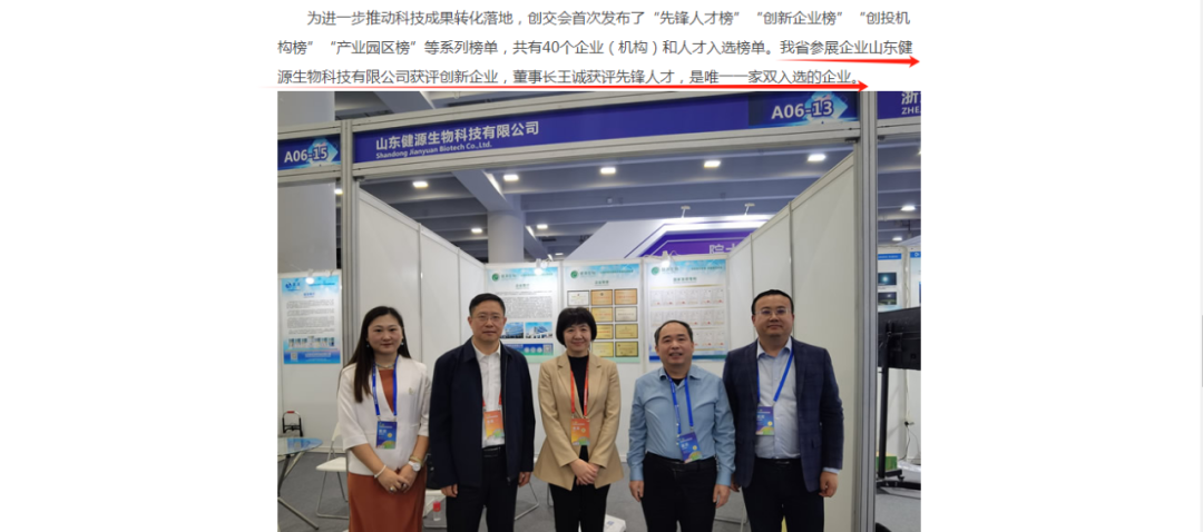 2023中國創(chuàng)新創(chuàng)業(yè)成果交易會于11月17日至19日在廣州舉辦。山東健源生物科技有限公司入選創(chuàng)新企業(yè)榜TOP10,董事長王誠入選先鋒人才榜TOP10,是山東省參展企業(yè)中唯一一家雙入選企業(yè)。
