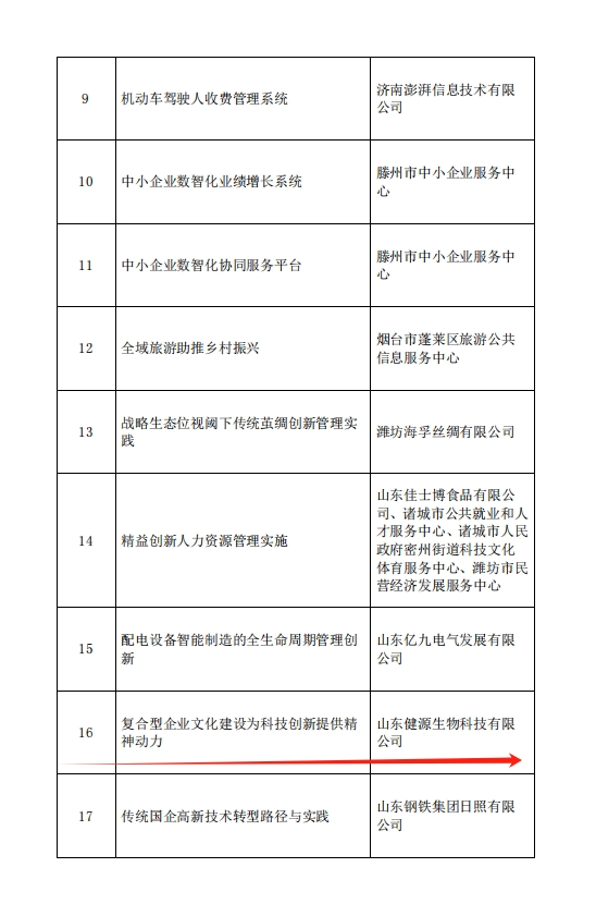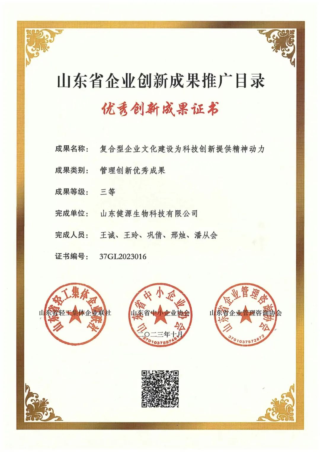 近日,山東省輕工集體企業(yè)聯(lián)社公布了《2023年企業(yè)創(chuàng)新優(yōu)秀成果推廣目錄名單》。山東健源生物科技有限公司的“復(fù)合型企業(yè)文化建設(shè)為科技創(chuàng)新提供精神動力”榮獲管理創(chuàng)新優(yōu)秀成果證書,并成功入選了山東省企業(yè)創(chuàng)新成果推廣目錄。