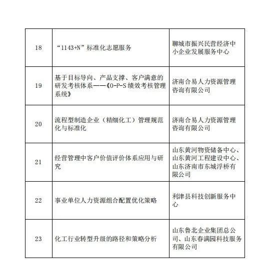 為深入貫徹黨的二十大精神,落實《工業(yè)和信息化部辦公廳關(guān)于開展數(shù)字化賦能、科技成果賦智、質(zhì)量標(biāo)準(zhǔn)品牌賦值中小企業(yè)全國行活動的通知》(工信廳企業(yè)函〔2023〕171號)要求,鼓勵、支持、引導(dǎo)廣大中小企業(yè)加大科研投入,增強(qiáng)創(chuàng)新能力,提高科技成果轉(zhuǎn)化和產(chǎn)業(yè)化水平,推動科技成果有效“賦智”中小企業(yè),持續(xù)增強(qiáng)核心競爭力,組織開展了2023年企業(yè)創(chuàng)新優(yōu)秀成果推廣目錄申報工作。經(jīng)企業(yè)自愿申報、各市中小企業(yè)主管部門和服務(wù)機(jī)構(gòu)初審?fù)扑]、專家評審認(rèn)定, 公示和異議復(fù)核等程序,確定將23項管理創(chuàng)新成果項目認(rèn)定為創(chuàng)新優(yōu)秀成果、新產(chǎn)品和論文,統(tǒng)一納入企業(yè)創(chuàng)新優(yōu)秀成果推廣目錄。
