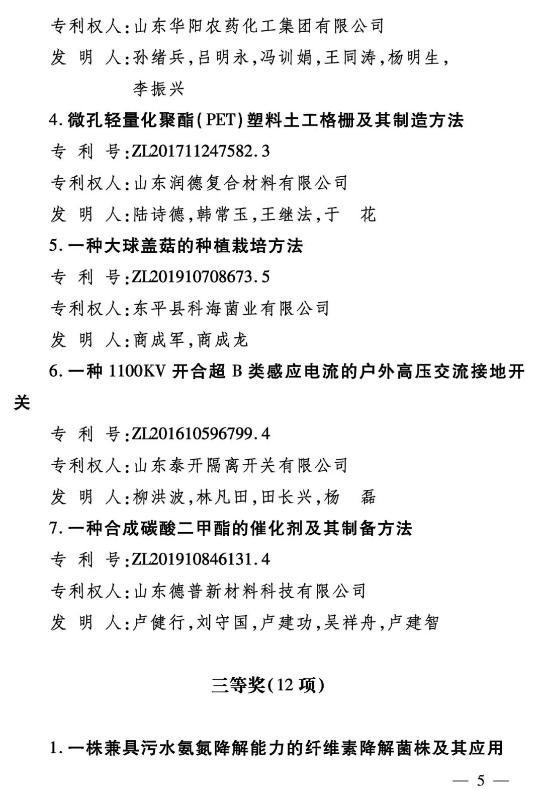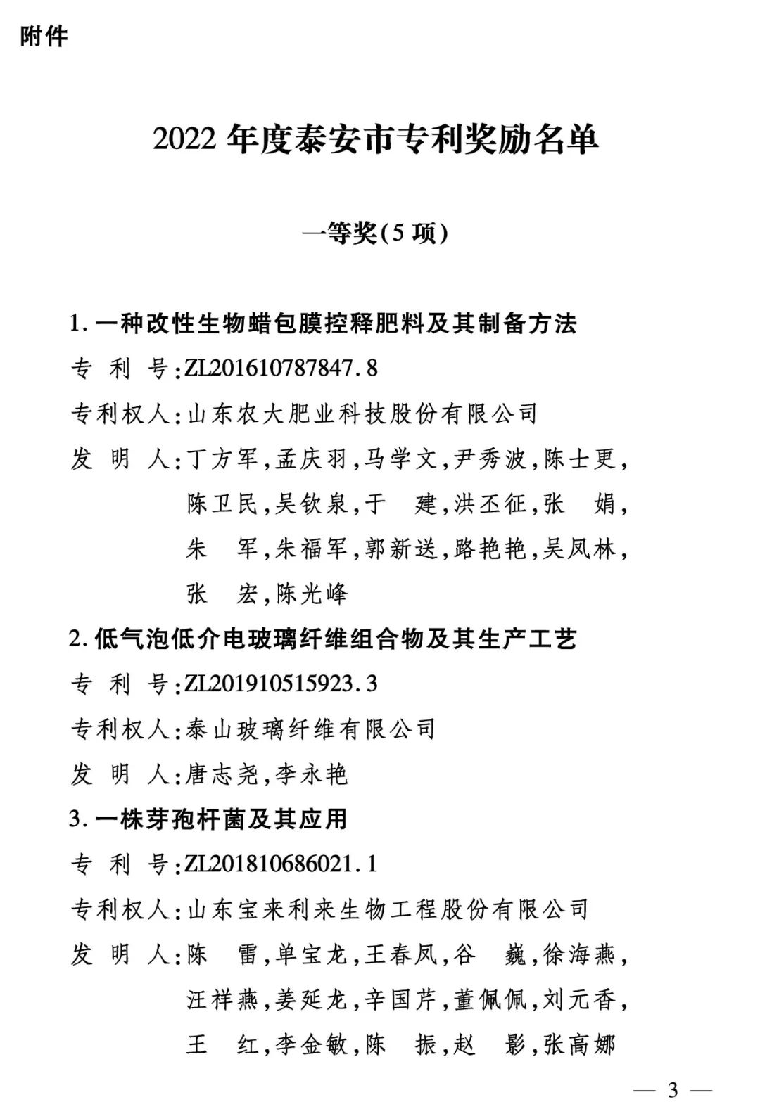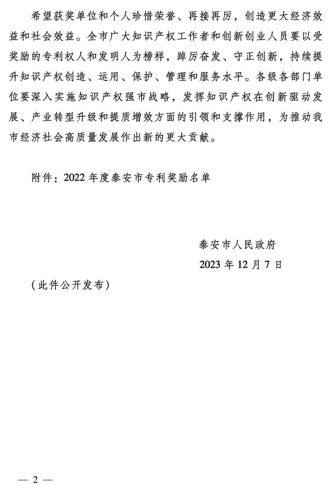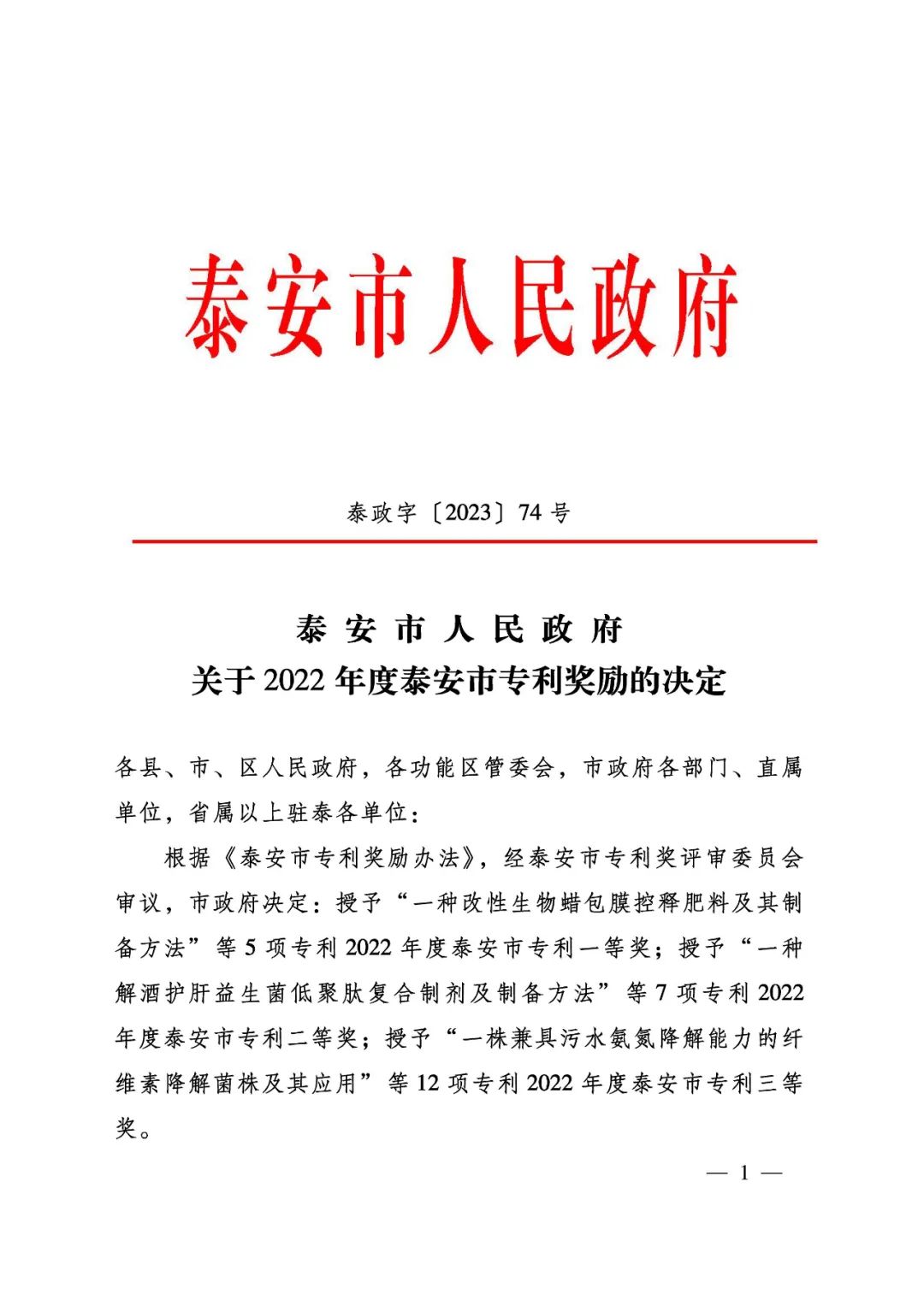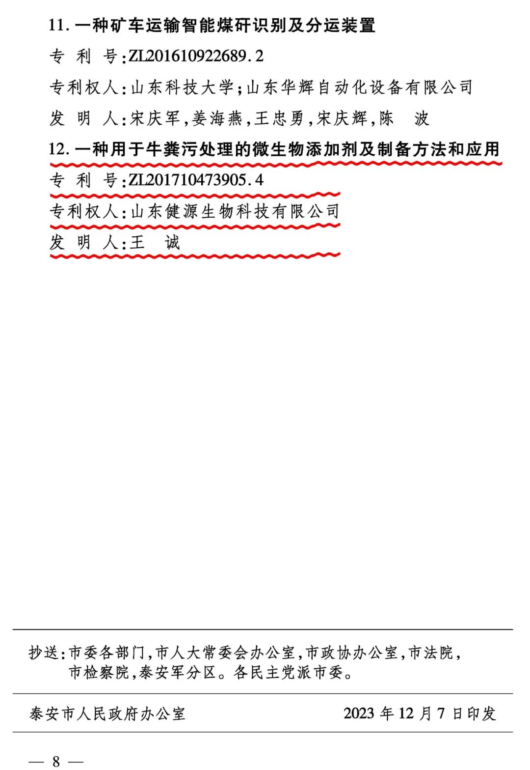 12月7日,泰安市人民政府發布關于2022年度泰安市專利獎勵的決定(泰政字【2023】74號),山東健源生物科技有限公司的“一種用于牛糞污處理的微生物添加劑及制備方法和應用”獲全市專利三等獎。