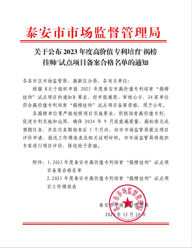 日前,泰安市市場監督管理局根據《關于組織申報2023年度泰安市高價值專利培育“揭榜掛帥”試點項目的通知》要求,經過申報推薦、審核公示,我市24家單位符合備案資格。山東健源生物科技有限公司成功入選2023年度高價值專利培育“揭榜掛帥”試點項目備案合格名單。