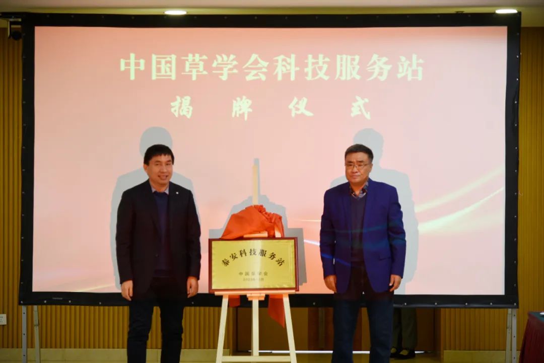 會上,李建蔚代表泰安市政府致辭,董磊介紹了泰安市創新驅動示范市建設情況。山東省科協學會部部長、一級調研員葛玉芝與王堃教授共同為中國草學會泰安科技服務站揭牌。