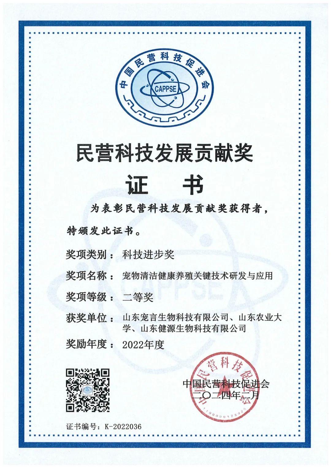 山東健源生物科技有限公司及旗下山東寵言生物科技有限公司聯合山東農業大學共同完成的“寵物清潔健康養殖關鍵技術研發與應用”項目榮獲“2022年度民營科技發展貢獻獎科技進步獎二等獎”。
