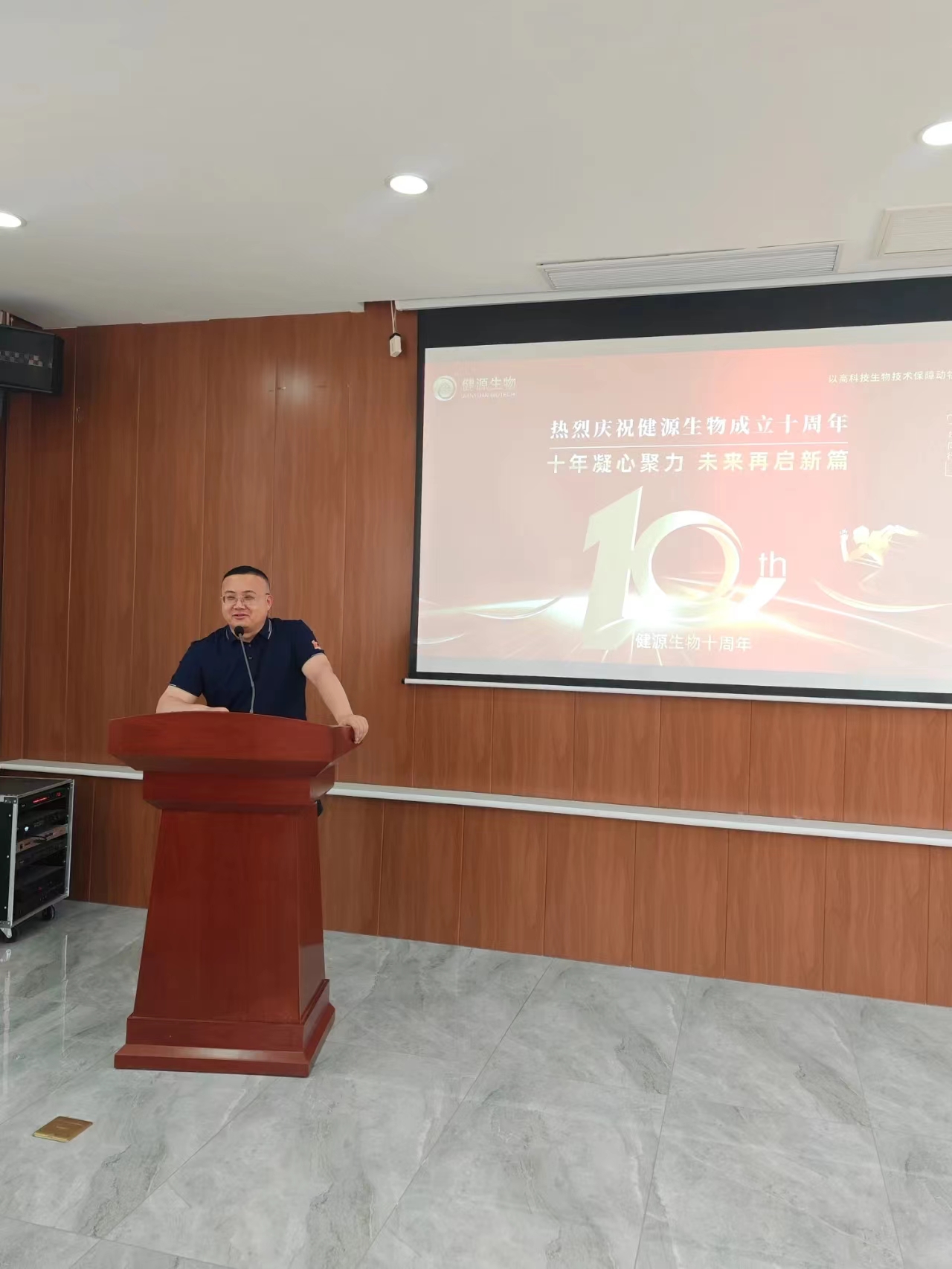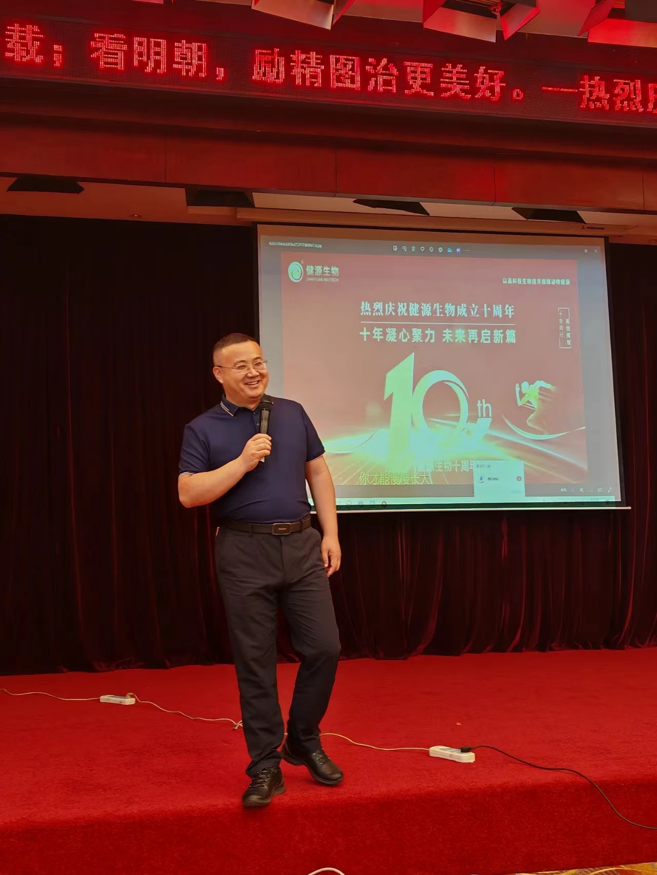 王誠董事長在講話中指出,健源生物十年來,克服了無資金、無經驗、無市場的創(chuàng)業(yè)困難,走出了一條他無我有、他有我優(yōu)、他優(yōu)我新的創(chuàng)新發(fā)展之路,實現了從無到有、從小到大、從弱到強的飛速發(fā)展。這一切離不開全體員工的緊密追隨,離不開客戶朋友的支持信任,離不開各級領導的關懷幫扶。健源生物將始終不忘初心牢記使命,堅守“誠實守信”的企業(yè)核心價值觀,打造生物科技新質生產力,以高科技生物技術造福人類。