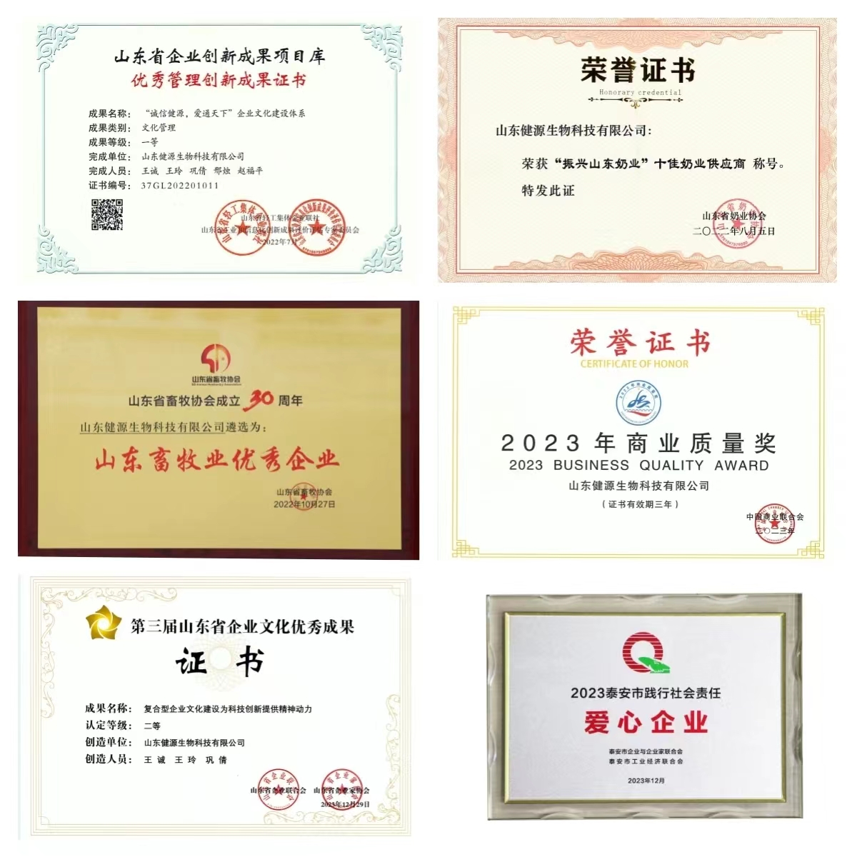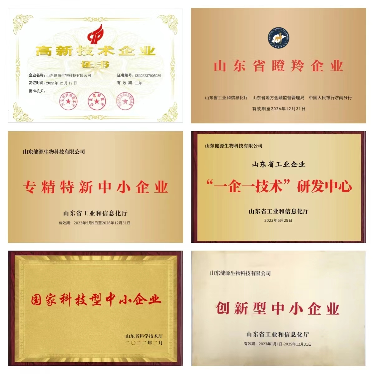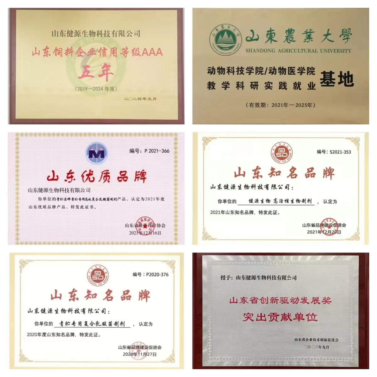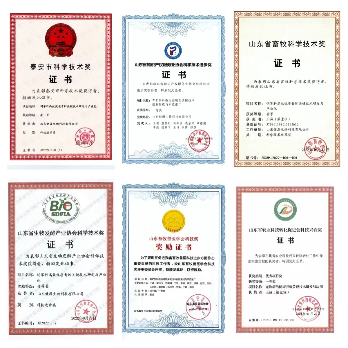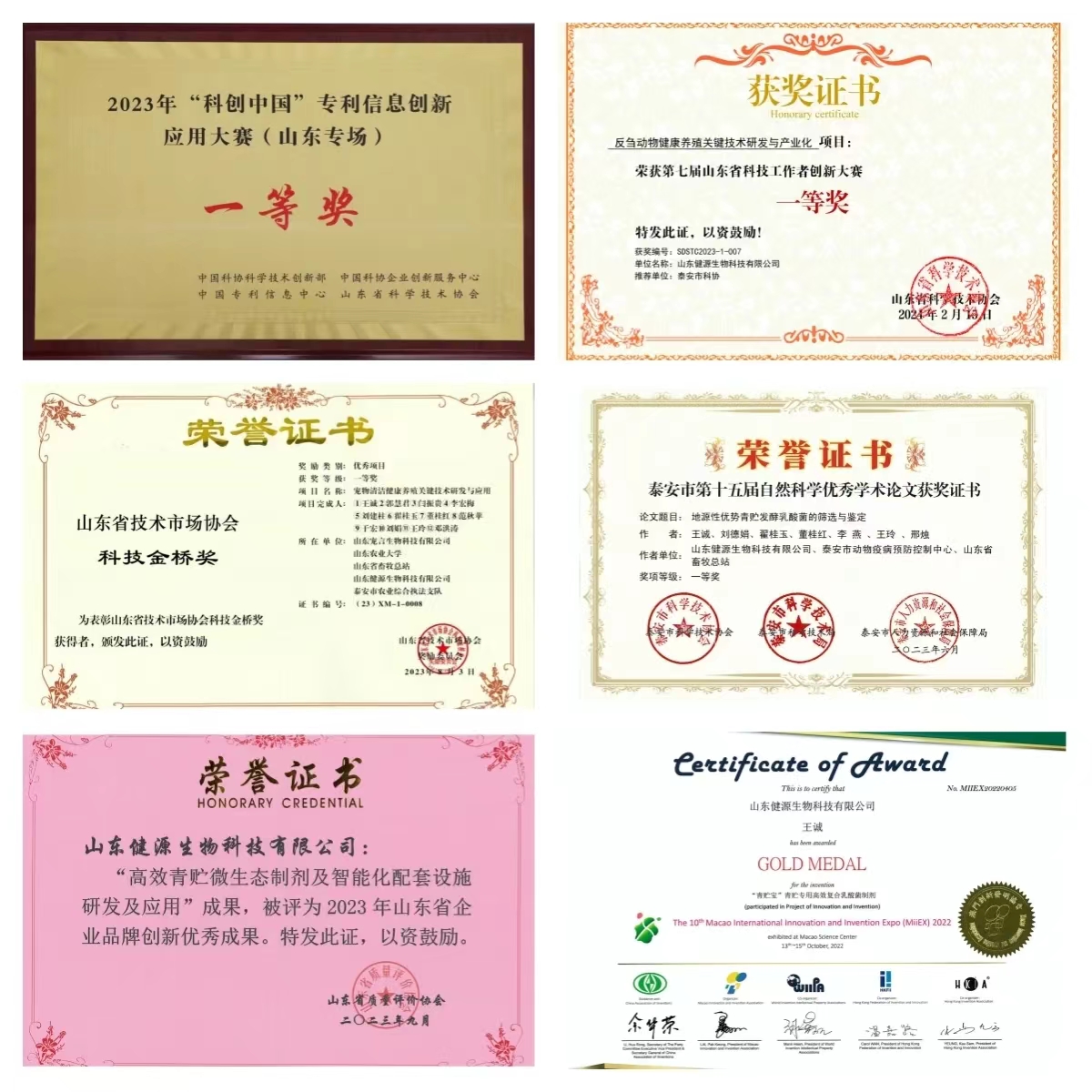 山東健源生物科技有限公司系國家高新技術企業(yè)、國家科技型中小企業(yè)、山東省瞪羚企業(yè)、山東省專精特新中小企業(yè)、山東省一企一技術研發(fā)中心、泰安市農業(yè)產業(yè)化重點龍頭企業(yè)。公司深耕動物微生態(tài)行業(yè)十年,主攻動物類生物大健康產品,研發(fā)出三十多種高活性生物制劑產品,致力于以高科技生物技術保障動物健康,現已獲得國家知識產權局頒發(fā)的各類專利證書100余項,其中包括32項國家發(fā)明專利、3項國際發(fā)明專利,60余項實用新型專利、14項軟件著作權,注冊商標100多個,還有正在申請中的國家發(fā)明專利20余項,累計榮獲市級科技獎項7項,省級科技獎項30余項,部級科技獎項12項。