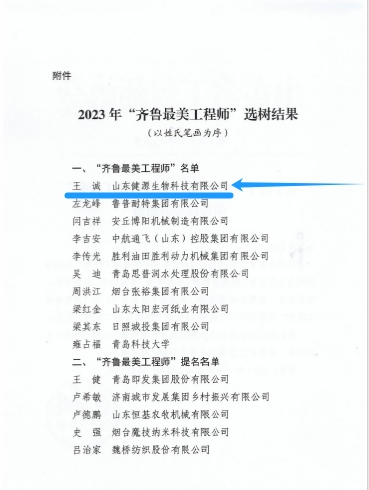 發布時間:[2024-7-5 15:51:56] 瀏覽量:2911次近日,山東省工程師協會下發關于授予2023年度“齊魯最美工程師”榮譽稱號的通報,山東健源生物科技有限公司董事長王誠被授予2023年度“齊魯最美工程師”榮譽稱號。