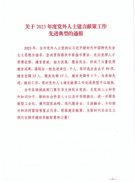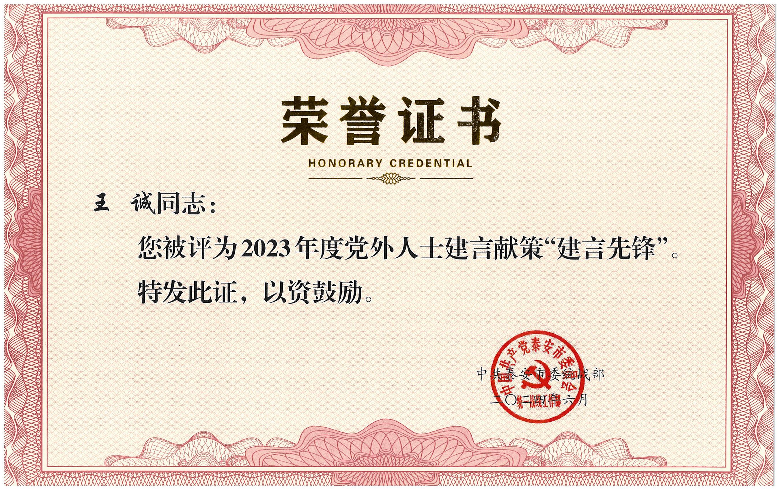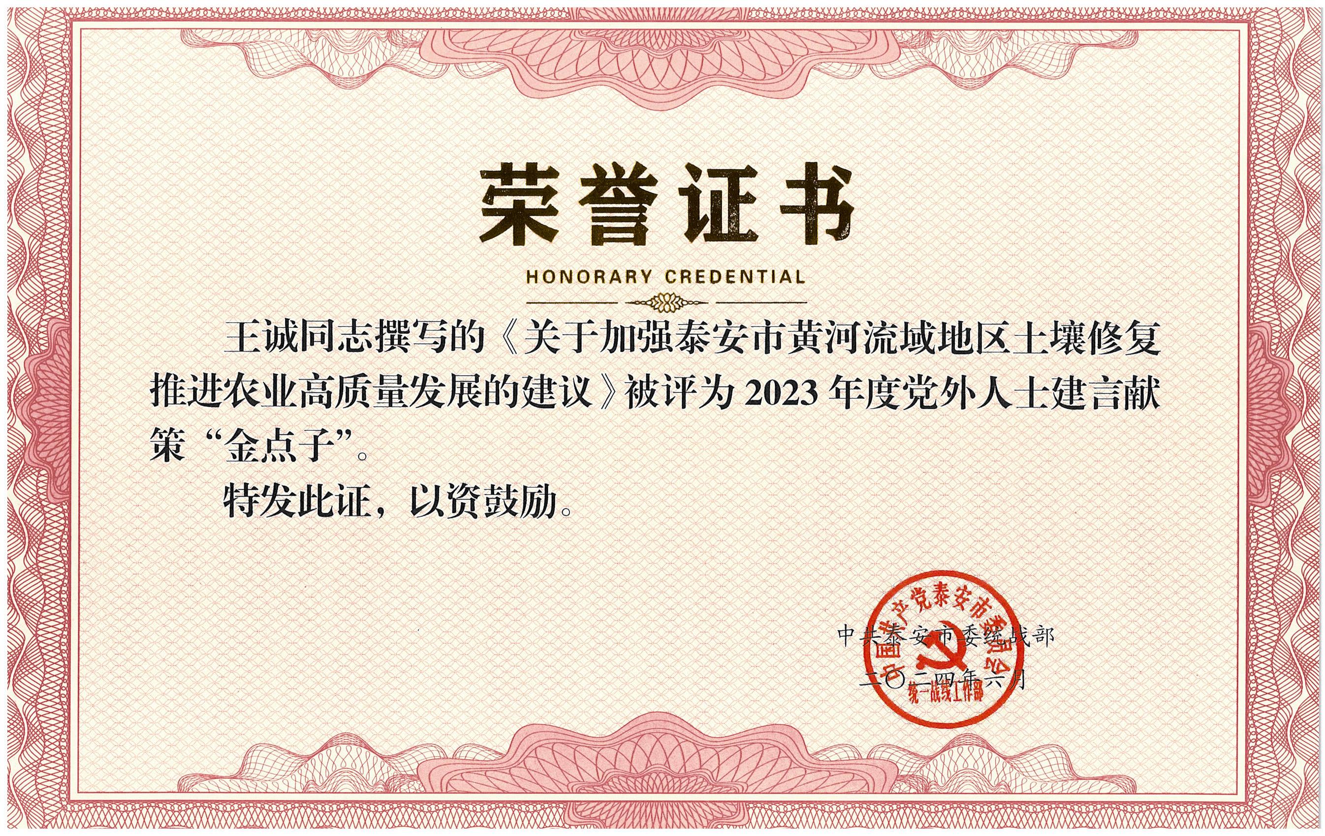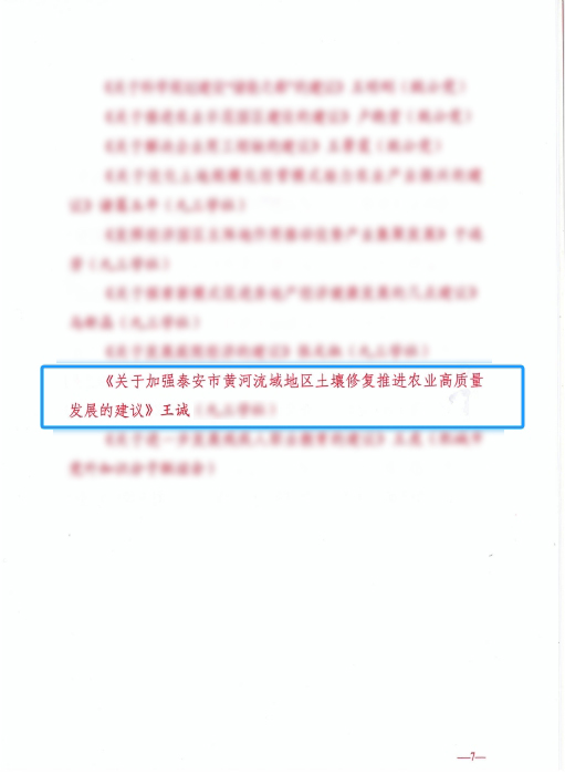 發(fā)布時間:[2024-7-9 17:52:5] 瀏覽量:3150次會上公布了《關于2023年度黨外人士建言獻策工作先進典型的通報》,王誠董事長被評為2023年度黨外人士建言獻策“建言先鋒”,撰寫的《關于加強泰安市黃河流域地區(qū)土壤修復推進農(nóng)業(yè)高質(zhì)量發(fā)展的建議》被評為2023年度黨外人士建言獻策“金點子”。