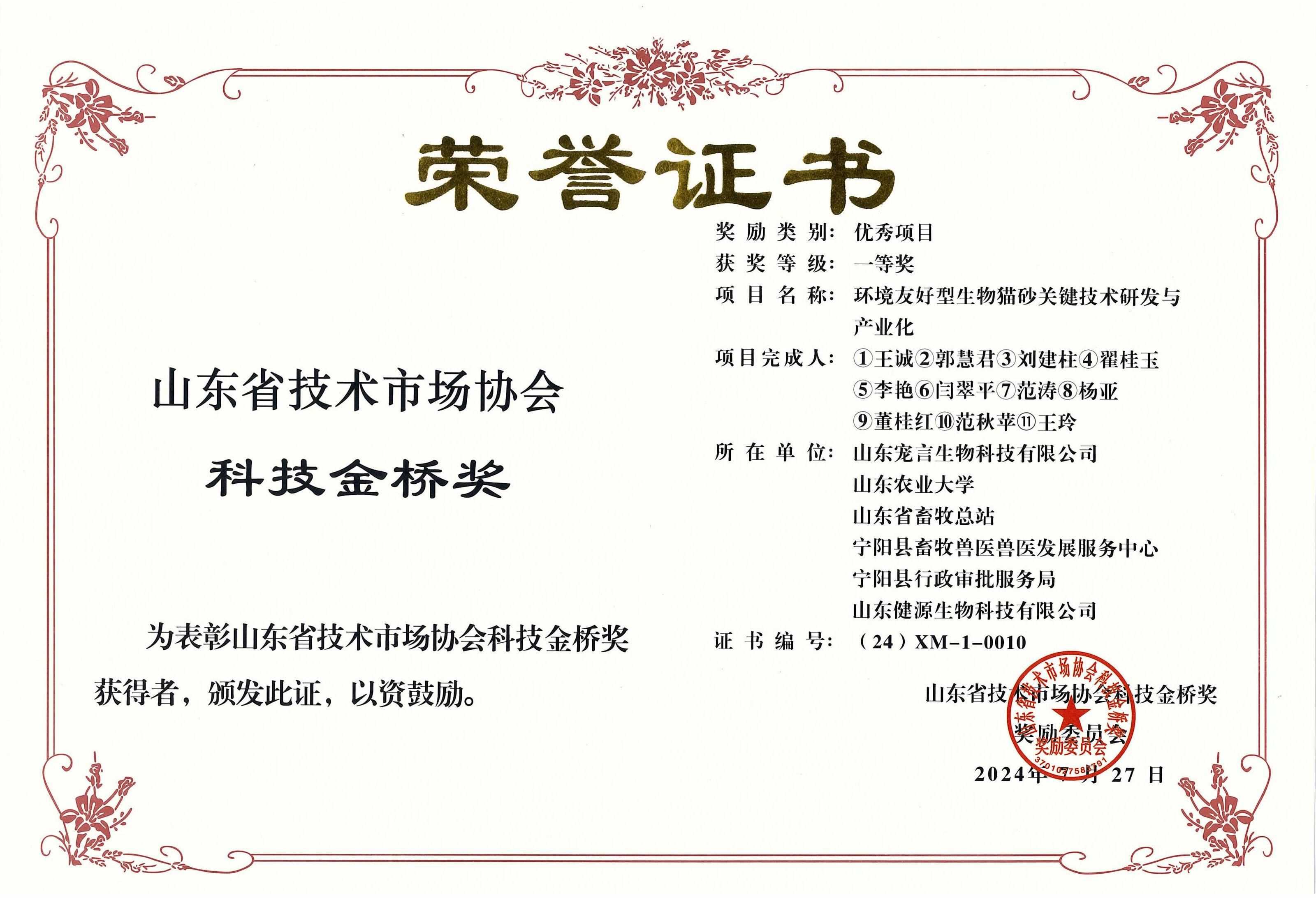 8月30日,2024年度山東省科技金橋獎表彰獎勵(lì)大會暨山東創(chuàng)新驅(qū)動發(fā)展高端論壇在山東省干部學(xué)院成功舉辦。山東健源生物科技有限公司與子公司山東寵言生物科技有限公司共同完成的“環(huán)境友好型生物貓砂關(guān)鍵技術(shù)研發(fā)與產(chǎn)業(yè)化”項(xiàng)目,經(jīng)過專業(yè)組評審、評審委員會評審、獎勵(lì)委員會終審,最終榮獲山東省技術(shù)市場協(xié)會科技金橋獎優(yōu)秀項(xiàng)目一等獎。