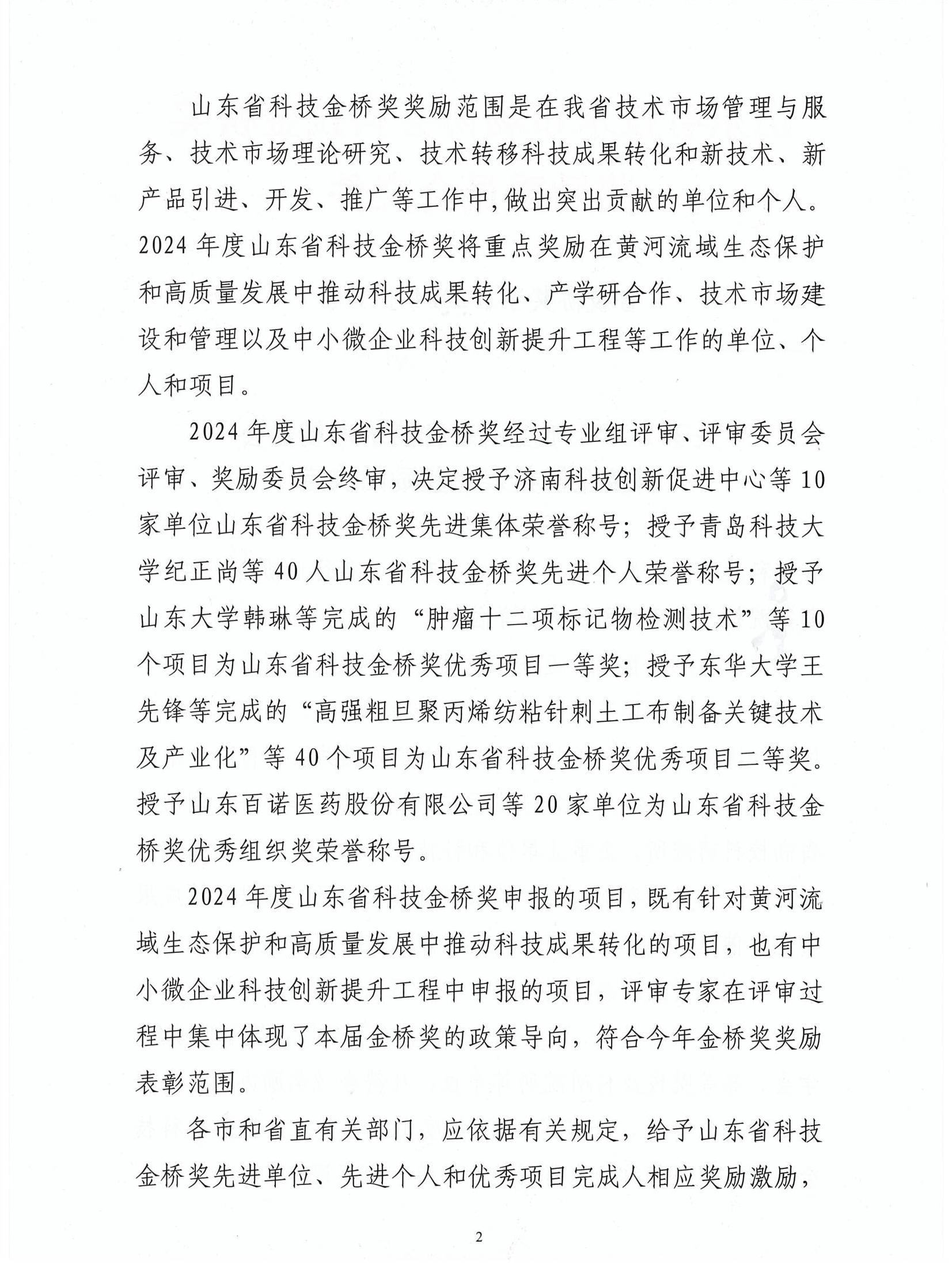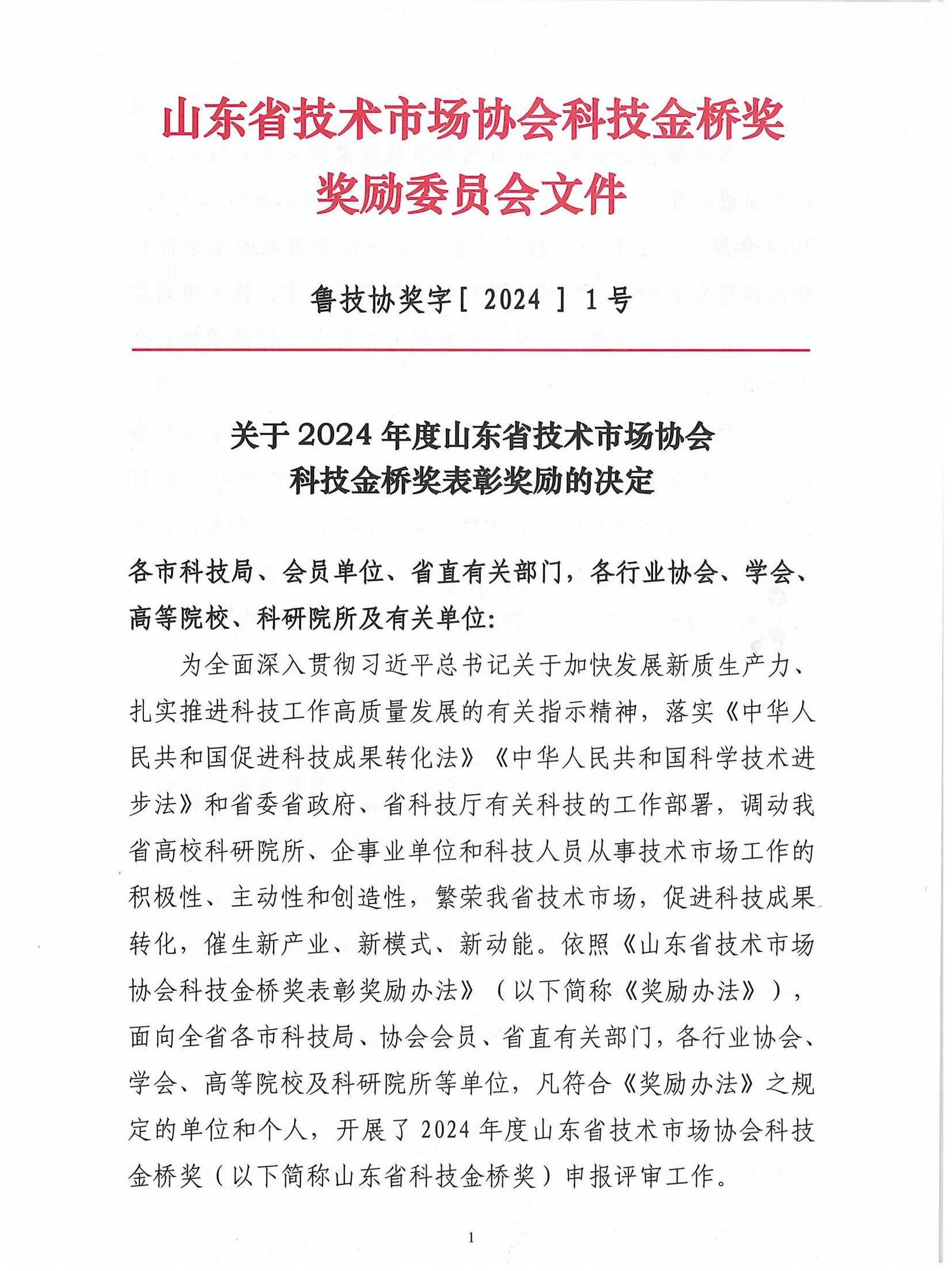 科技金橋獎是山東省科技廳備案的省內(nèi)技術(shù)市場領(lǐng)域最高獎項(xiàng),本屆金橋獎重點(diǎn)獎勵(lì)在黃河流域生態(tài)保護(hù)和發(fā)展新質(zhì)生產(chǎn)力中推動科技成果轉(zhuǎn)化、產(chǎn)學(xué)研合作以及為我省科技大市場建設(shè)中做出突出貢獻(xiàn)等工作的單位、個(gè)人和項(xiàng)目,共評出50個(gè)優(yōu)秀項(xiàng)目,其中一等獎10個(gè)。