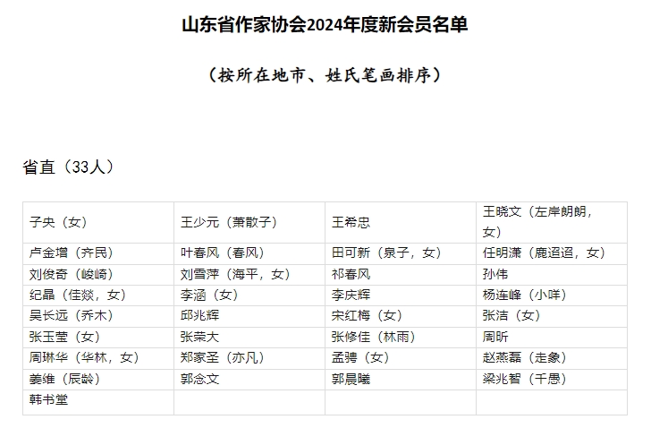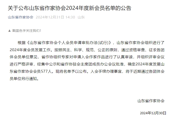 根據(jù)《山東省作家協(xié)會個人會員申請審批辦法(試行)》,山東省作家協(xié)會組織進行了2024年度會員發(fā)展工作。按照民主、科學(xué)、規(guī)范、公正的原則,通過資格審查、征求各團體會員單位意見,省作協(xié)組織專家對申請入會作家作品進行了認(rèn)真審讀,并組織評審會議進行嚴(yán)格評審,經(jīng)集中公示和省作協(xié)駐會主席團成員辦公會議批準(zhǔn),確定2024年度發(fā)展山東省作家協(xié)會會員577人。