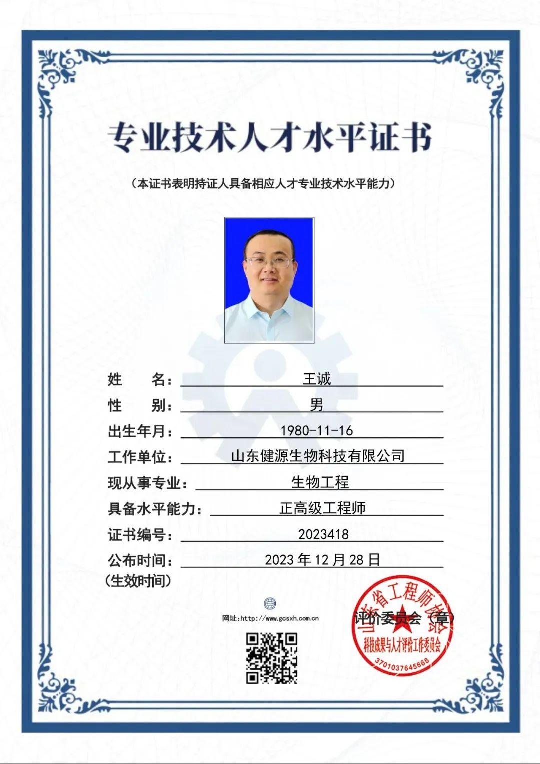 2024-3-2 董事長王誠榮獲正高級工程師專業技術人才水平證書