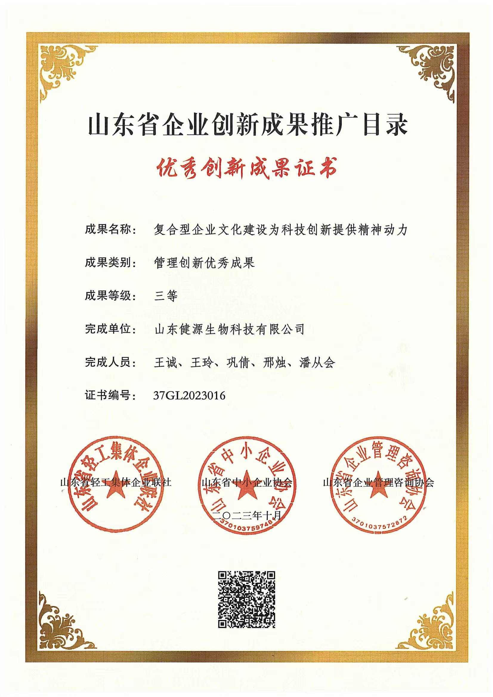 2023-12-1 健源生物榮獲管理創新優秀成果證書并入選山東省企業創新成果推廣目錄