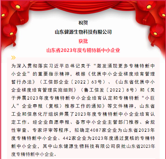 2023-5-15 山東健源生物獲批山東省2023年度專精特新中小企業