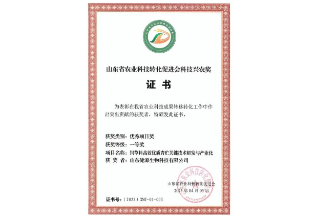 2023-6-1 山東健源生物榮獲山東省農業科技轉化促進會科技興農獎一等獎