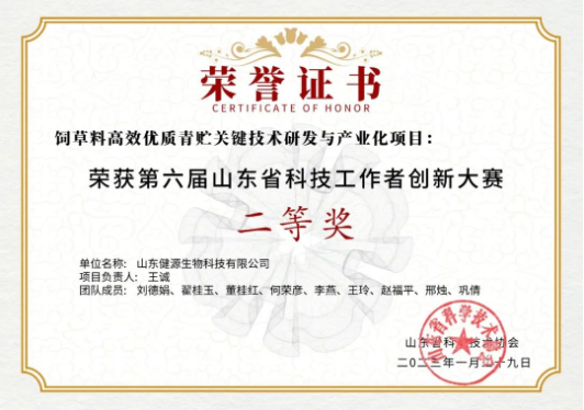由山東省科學技術協會主辦,山東電子學會承辦的"第六屆山東省科技工作者創新大賽”1月6日完成總決賽。本年度賽事領域聚焦《山東省國民經濟和社會發展第十四個五年規劃和2035年遠景目標綱要》和省第十二次黨代會報告中確定的重點發展產業設立6個賽項,分別是:新一代信息技術、高端裝備、新能源新材料、醫養健康、高端化工、現代農業。經各推薦單位征集遴選擇優推薦參賽,專家初審、復審、決賽等環節,從281項參賽作品中評選出獲獎項目89個。其中,山東健源生物科技有限公司《飼草料高效優質青貯關鍵技術研發與產業化》項目榮獲第六屆山東省科技工作者創新大賽二等獎。