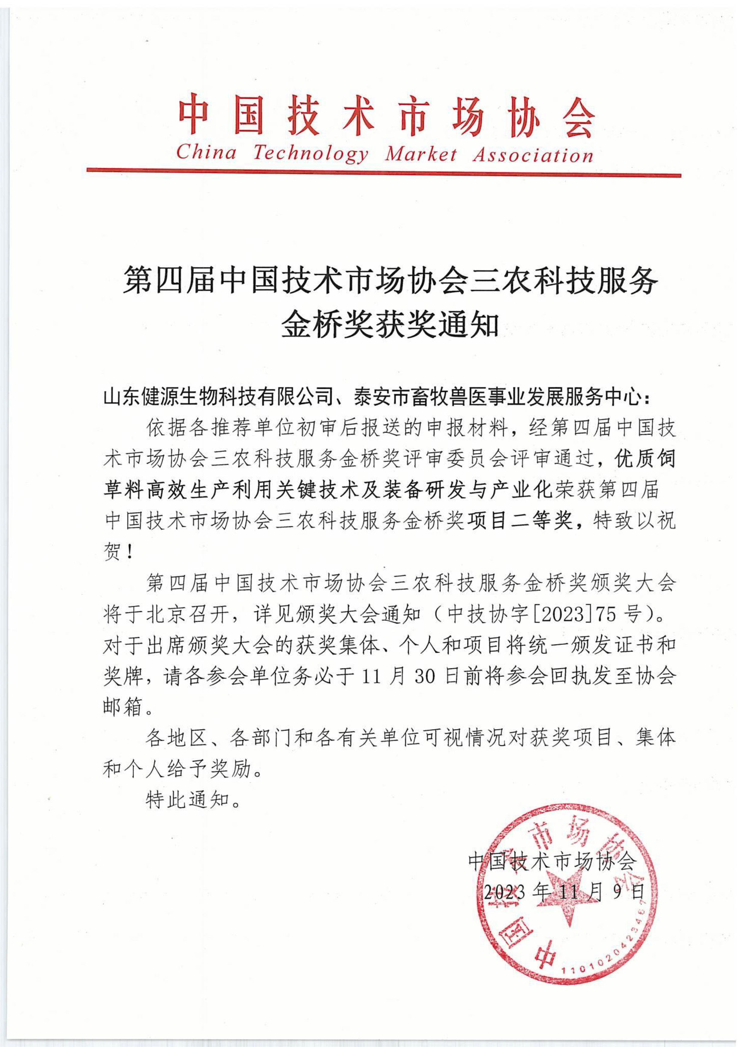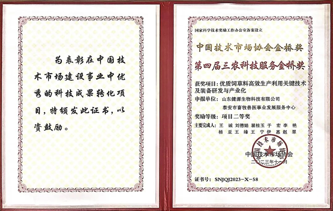 山東健源生物科技有限公司《優(yōu)質(zhì)飼草料高效生產(chǎn)利用關(guān)鍵技術(shù)及裝備研發(fā)與產(chǎn)業(yè)化》項(xiàng)目榮獲中國技術(shù)市場(chǎng)協(xié)會(huì)金橋獎(jiǎng)第四屆三農(nóng)科技服務(wù)獎(jiǎng)項(xiàng)目二等獎(jiǎng)。