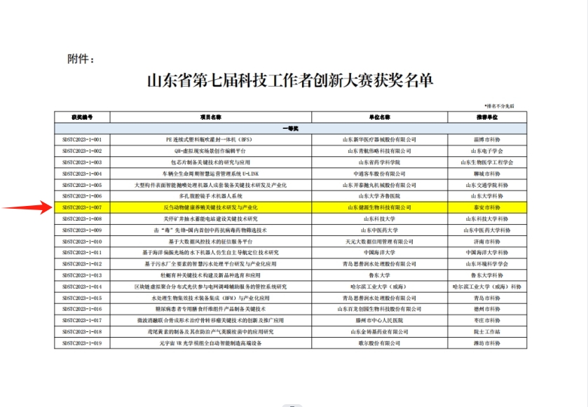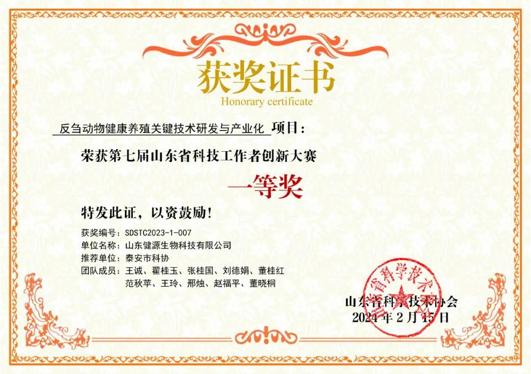 由山東健源生物科技有限公司申報,泰安市科協(xié)推薦的《反芻動物健康養(yǎng)殖關鍵技術研發(fā)與產(chǎn)業(yè)化》項目榮獲第七屆山東省科技工作者創(chuàng)新大賽一等獎。