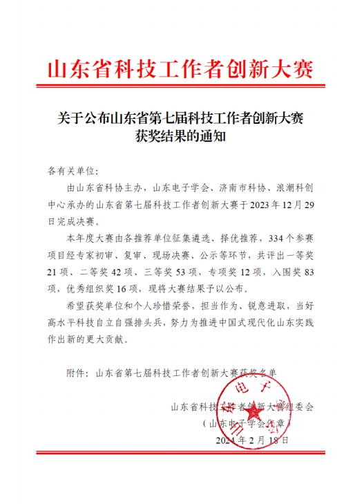由山東省科協(xié)主辦,山東電子學會、濟南市科協(xié)、浪潮科創(chuàng)中心承辦的山東省第七屆科技工作者創(chuàng)新大賽于2023年12月29日完成決賽。本年度大賽由各市科協(xié)、省級學會、高校科協(xié)、院士工作站等征集遴選、擇優(yōu)推薦的334項參賽項目,經(jīng)專家初審、復審、現(xiàn)場決賽、公示等環(huán)節(jié),共評出一等獎21項,二等獎42項,三等獎53項,專項獎12項,入圍獎83項,優(yōu)秀組織獎16項。